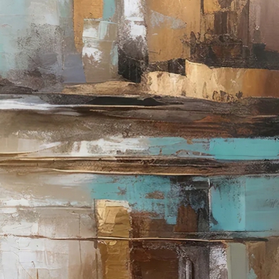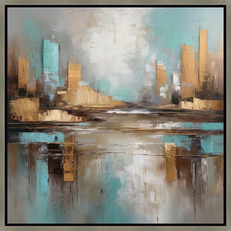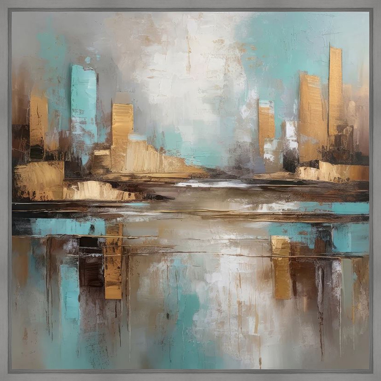 Dit werk is vierkant van vorm en is uitgevoerd in diverse grijs- en zandkleuren met turquoise accenten die levendigheid en spanning brengen. Het is een vriendelijk werk waar al snel een mooi plekje voor te vinden zal zijn.