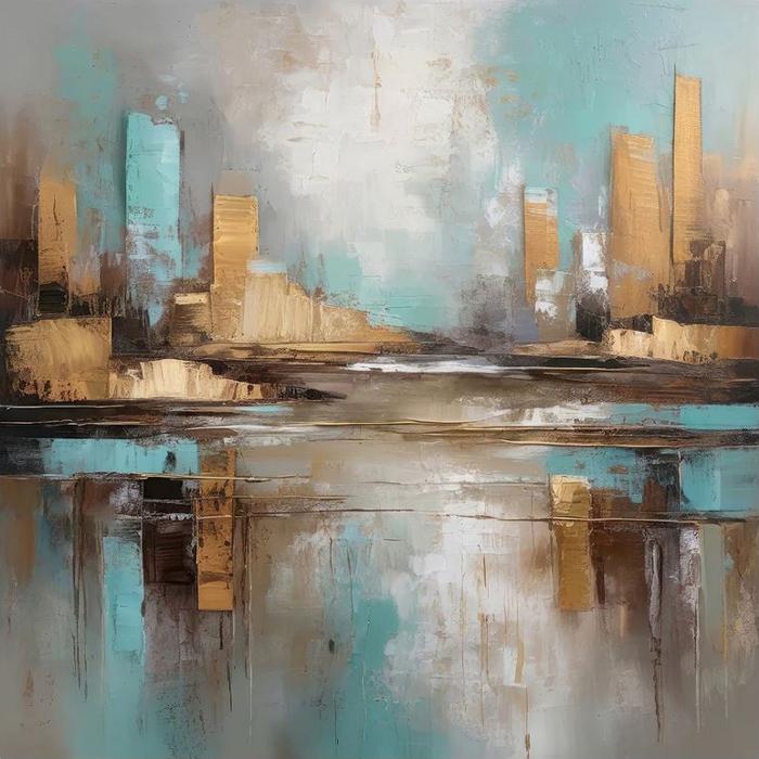 Een prachtig werk van een stad die zich zomaar toont in de woestijn... de zanderige kleuren... de gebouwen die hoog uittorenen boven alles heen en de weerspiegeling op het water of is het toch zand? In de woestijn weet je niets zeker. Is het echt? Of is het een fata morgana? We zullen het wel nooit weten...