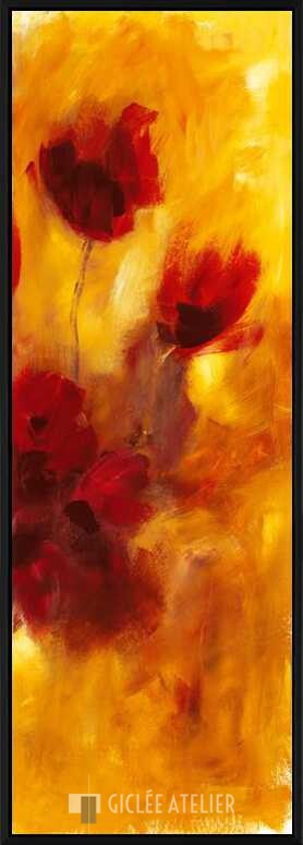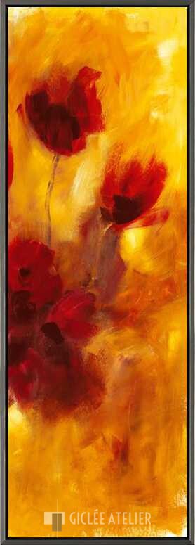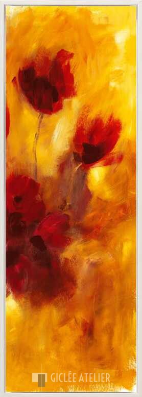 Dit hoog opgaande werk brengt een grote dosis warmte en vrolijkheid door de rode, oranje en gele kleurtonen. De dieprode bloemen op dit werk zijn op een abstracte wijze weergegeven en matchen perfect in hun kleurrijke omgeving.