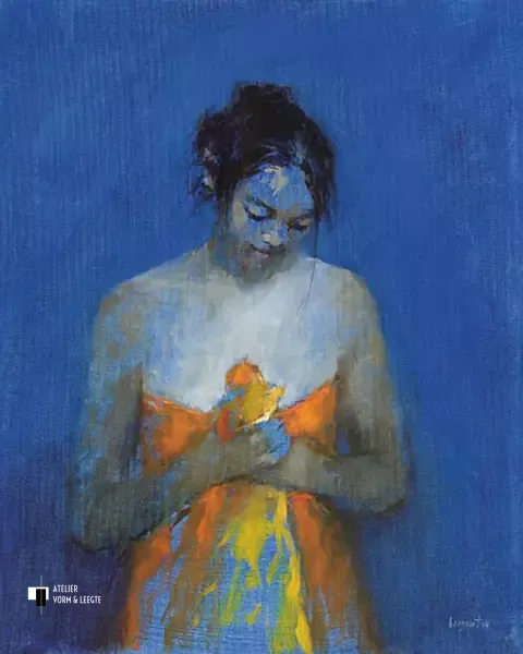 Een dame kijkt met een ingetogen devotionele blik schuin omlaag. Haar haren zijn omhoog gebonden. De omslagdoek, die ze om haar deels ontblote lichaam heeft gedrapeerd houdt ze met de handen bijeen. Het warme oranje en geel in de doek geeft een kleurrijk contrast met het diepe blauw wat in de achtergrond van het schilderij aanwezig is.