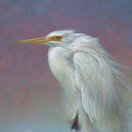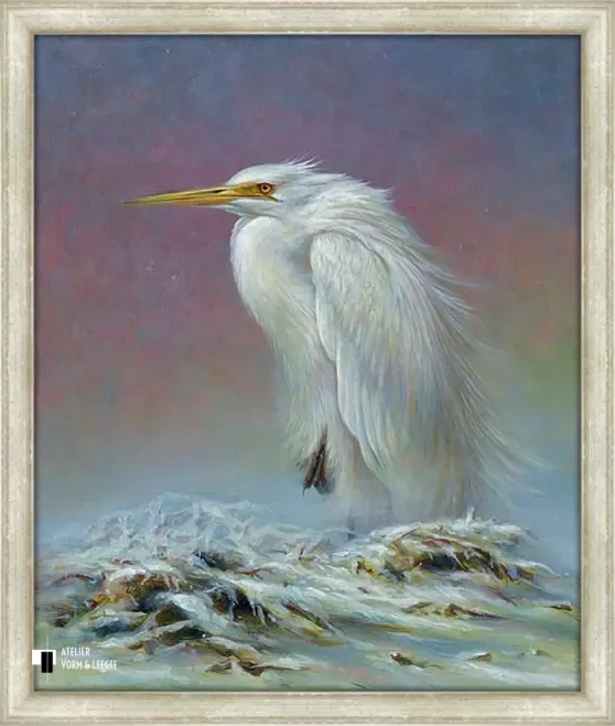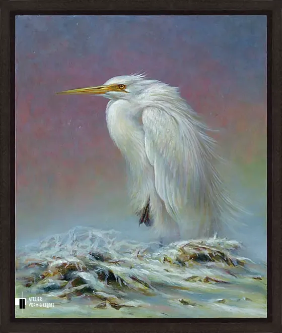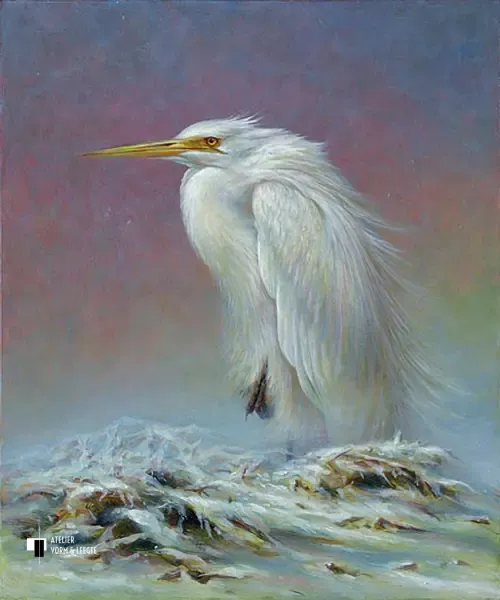 Met scherpe blik en een alerte aanwezigheid wacht de grote witte zilverreiger geduldig op haar prooi in een sneeuwwit landschap. De vogel lijkt in alle rust te wachten tot het juiste moment zich aandient en speurt zo naar beweging. Deze sierlijke vogel is op het doek gezet door kunstschilder Erik van Ommen. Deze sierlijke vogel is op het doek gezet door kunstschilder Erik van Ommen.