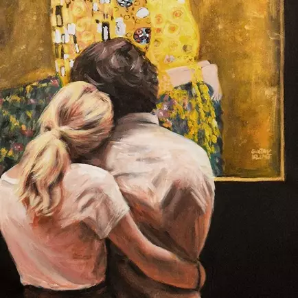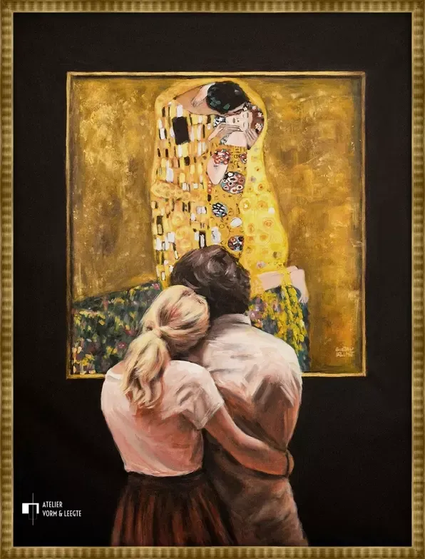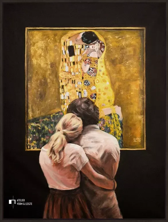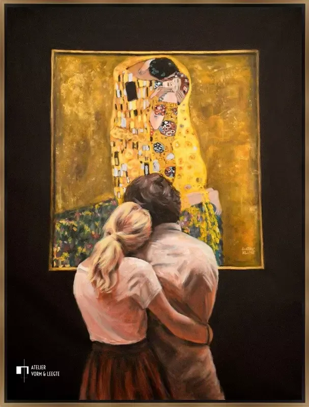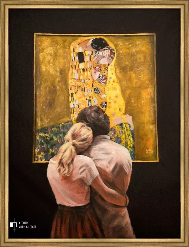 Twee geliefden in het museum kijken samen naar het bekende meesterwerk van Gustav Klimt, genaamd De Kus. Het gevoel van de geliefden in de kus en het gevoel van de geliefden die het doek aanschouwen lijkt hetzelfde te zijn. De meesterlijke hand van Escha van den Bogerd heeft hier weer een schilderij van gemaakt, zodat er opnieuw twee geliefden naar kunnen kijken...