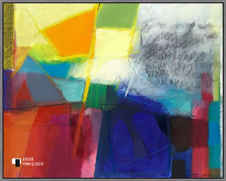 Kleurrijk Landschap van Heleen van der Tuin aan de wand