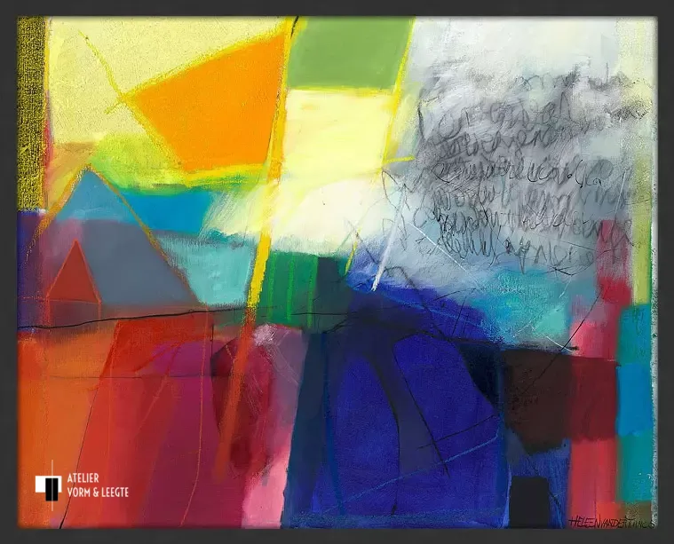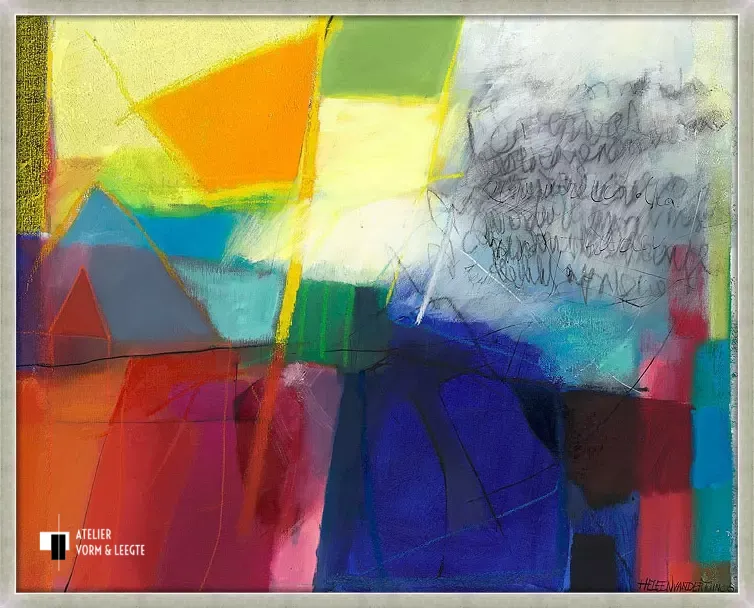 In felle vrolijke kleurtonen zien we hier een landschap waar huisjes en landerijen elkaar ontmoeten in abstractie. Links in beeld zien we de duidelijke contouren van een huisje, terwijl meer naar rechts de kleurvlakken de verschillende akkers lijken te zijn. Het werk laat ook volop ruimte voor de eigen fantasie en er de eigen voorstellingen in te ontdekken.
