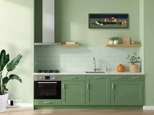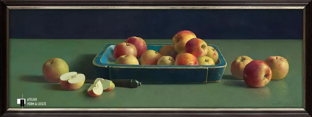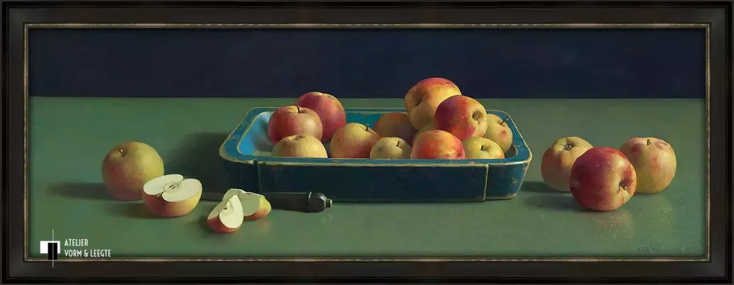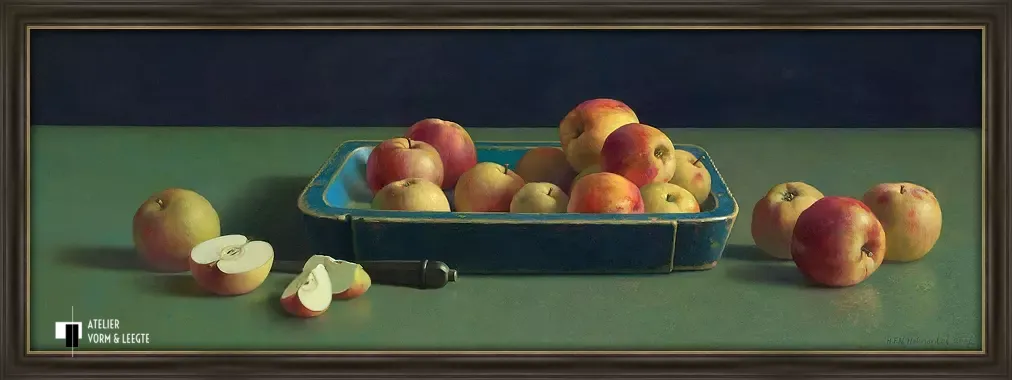 Blauwe bak met appels van Henk Helmantel aan de wand