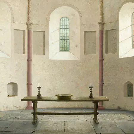 De bogen van de absis van de romaanse kerk in Bozum zijn fenomenaal. Hier zien we de absis afgebeeld - kijkend richting het koor - dat in de 12e eeuw gebouwd is uit tufsteen. Het licht wat door de rondboogramen valt geeft het geheel een mystieke sfeer. Henk Helmantel heeft de beleving van deze kerk goed weten te vangen op het doek. Een werk om stil van te worden...