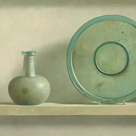 Romeins glas in kast laat een verzameling antieke glaskunst zien, die uitgestald staat in een kast. Het Romeinse glas bestaat uit karaffen, schalen, borden en heeft prachtige blauwgroene kleuren. Kunstchilder Henk Helmantel heeft het glas met een bijzondere fijnzinnigheid geschilderd. De precisie, de lichtval en de schaduwwerking maken dit tot een bijzonder meesterwerk. Als je dit schilderij aan de muur hangt, zou je bijna denken dat er echt een kastje met glaskunst hangt.