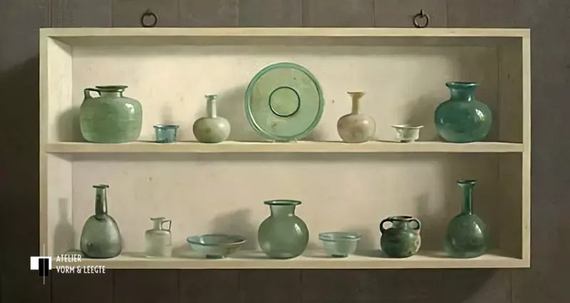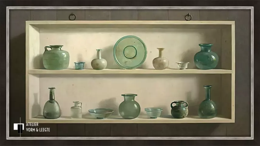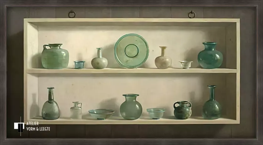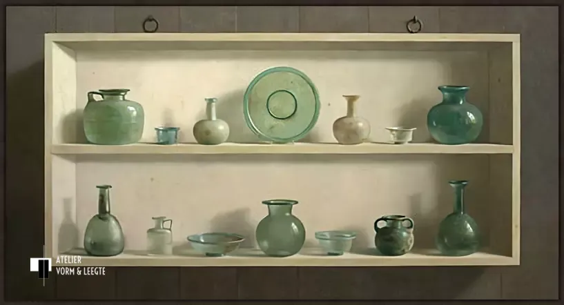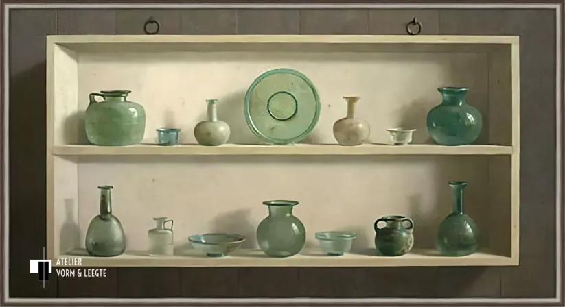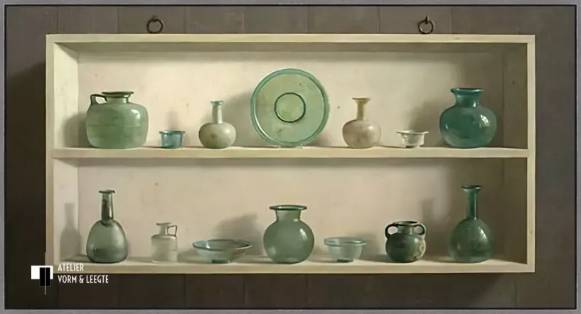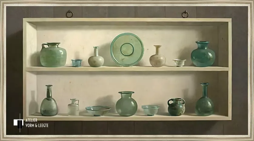 ‘Romeins glas in kast’ van Henk Helmantel aan de wand