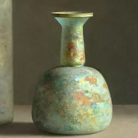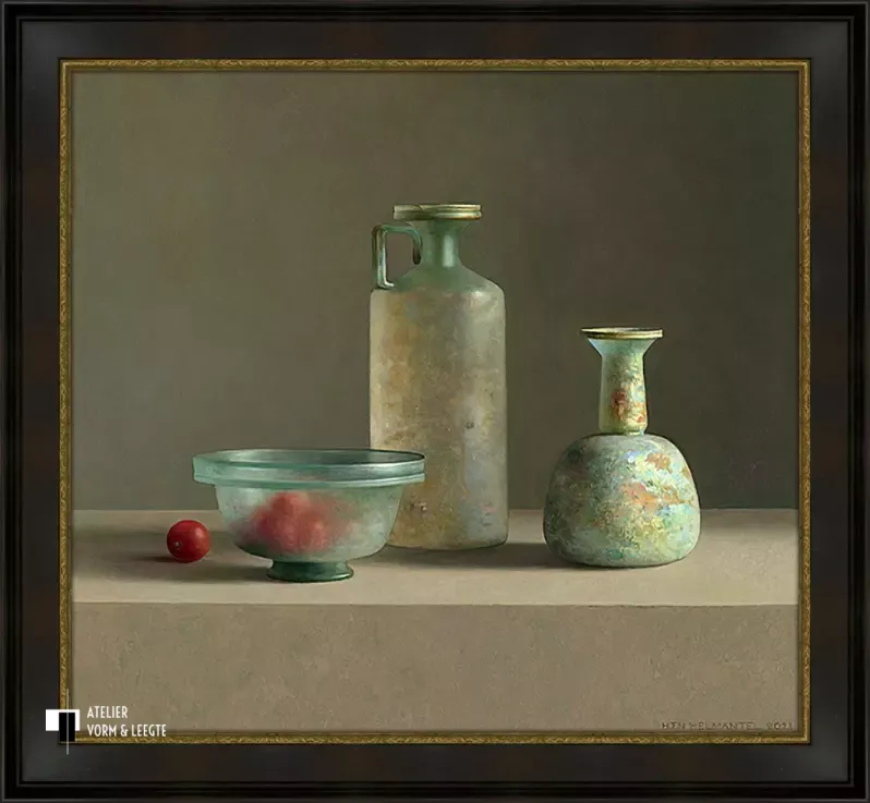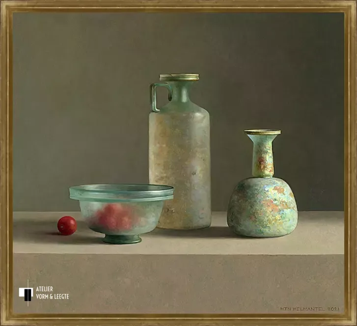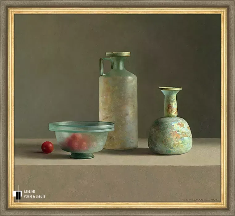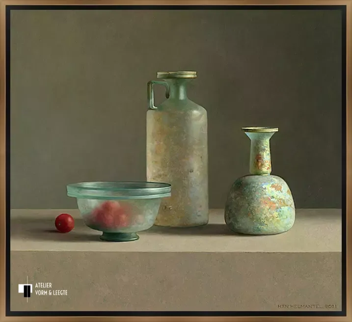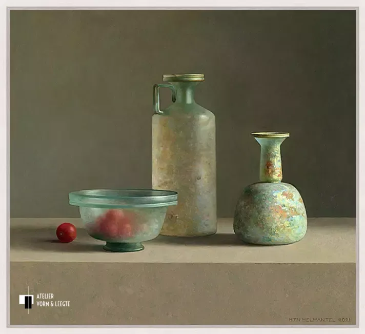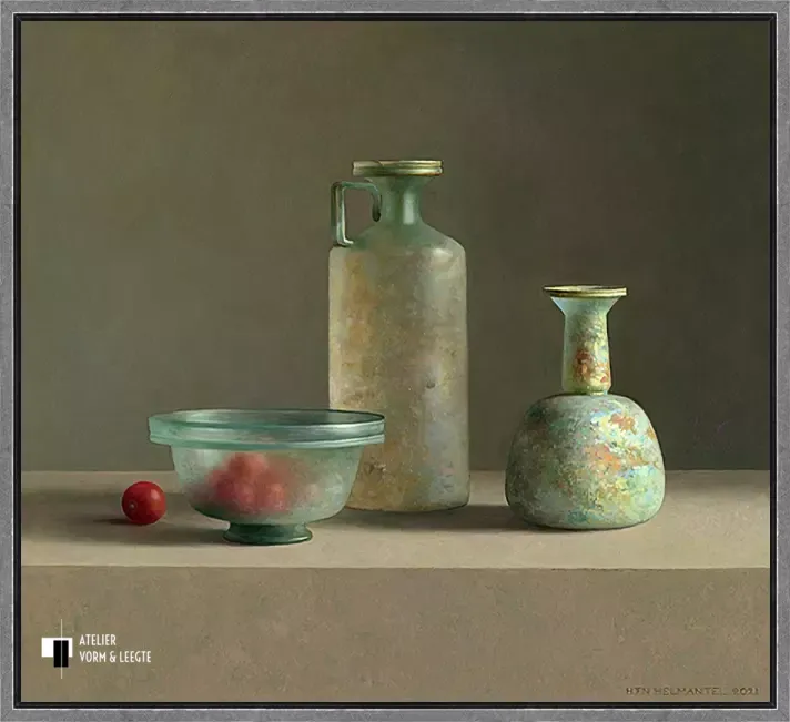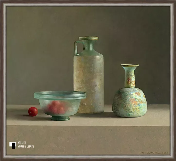 Dit is een stilleven uit de serie Romaans glas. Het antieke Romaanse glas is een geliefd onderwerp van kunstschilder Henk Helmantel. De kleuren die in dit glas aanwezig zijn en het matte oppervlak lenen zich prachtig om over te brengen op het schildersdoek. Op dit werk is de compositie eenvoudig gehouden.