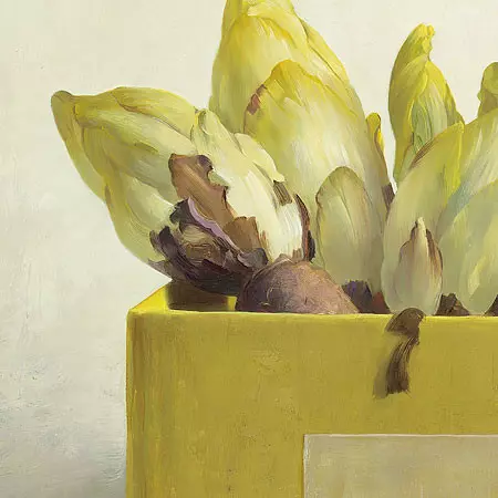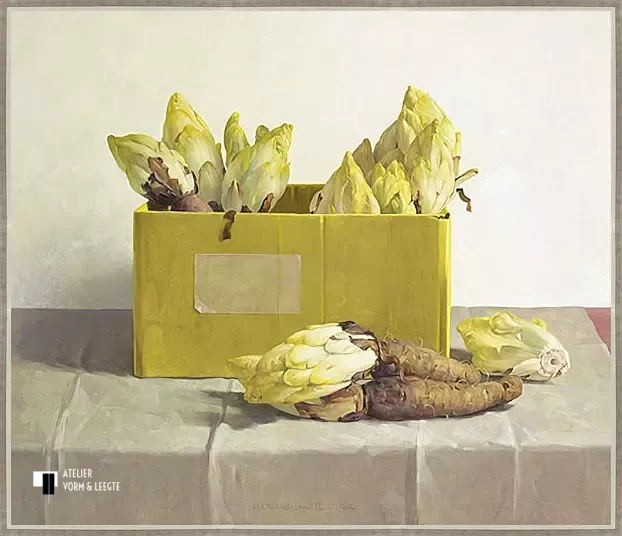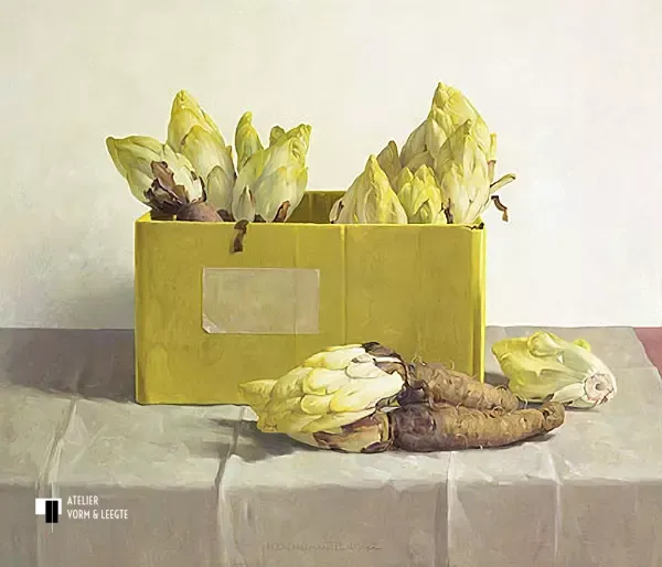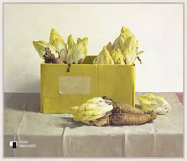 Witlof in een gele doos is een bijzonder stilleven van Henk Helmantel. Op dit doek is zoiets alledaags als stronkjes witlof tot meesterlijke kunst verheven. Een prachtige lichtval op het doek. Een bijzondere kleurcombinatie van de witgele lof met de geel kartonnen doos. De wortels die nog aan de lof zitten geven een aangenaam contrast in dit werk.