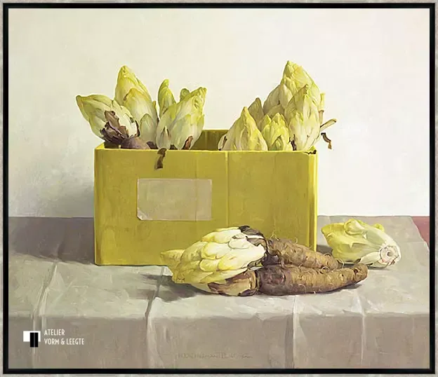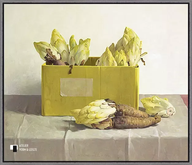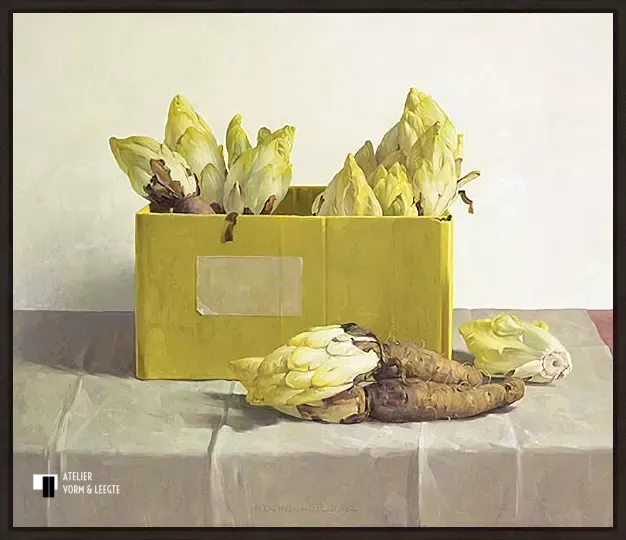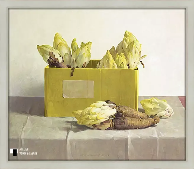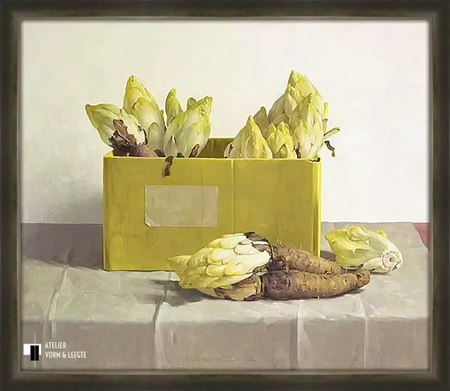 Witlof in gele doos (in Shabby Chic lijst) van Henk Helmantel aan de wand