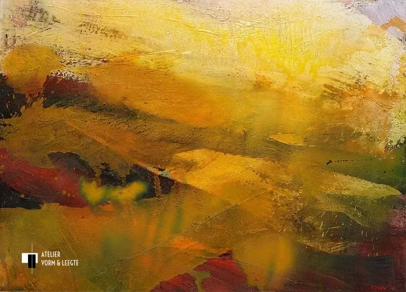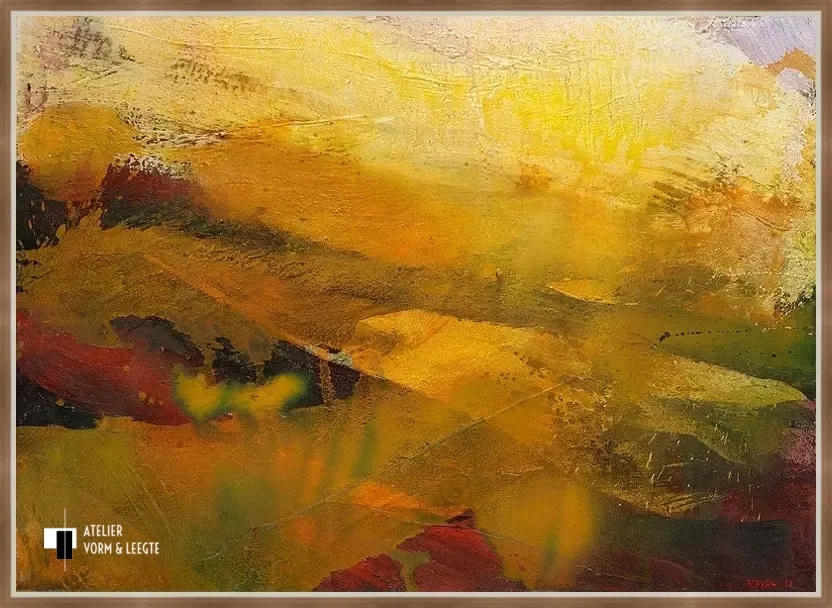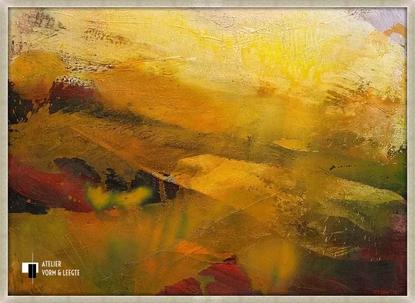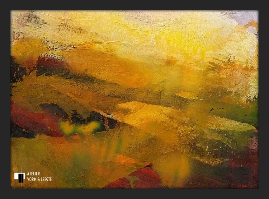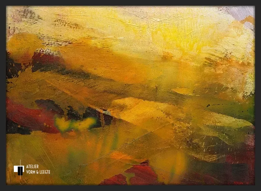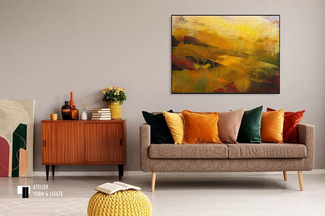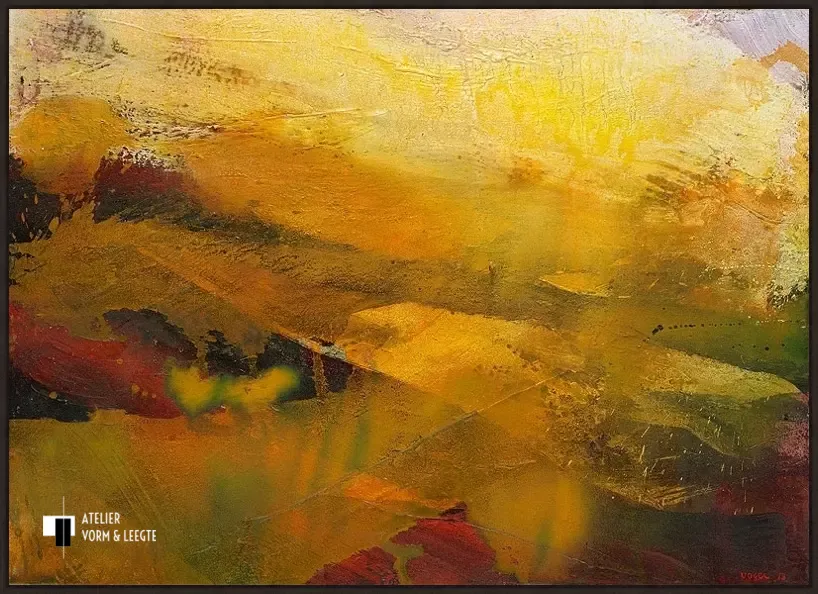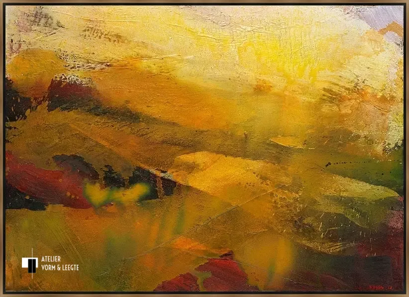 Met zonnige kleuren en bewegingen die het verloop van de tijd lijken te symboliseren is op dit doek een fascinerend abstract kunstwerk ontstaan. Kunstschilder Henrie Vogel heeft hier warm okergeel de hoofdrol gegeven en dit gecombineerd met oranjerode kleuraccenten. De titel van dit werk is 'Ruimte met okergeel'. Het formaat is royaal waardoor het ook uitstekend geschikt is voor bijvoorbeeld boven een bank.
