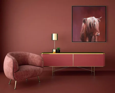 Een indringend portret van een Schotse Hooglander in warme rode kleurtonen. Met een enigszins losse toets is het dier, compleet met zijn lange haren en de karakteristieke hoorns op het doek vereeuwigd. De geabstraheerde achtergrond geeft nog meer karakter aan de Hooglander zelf.