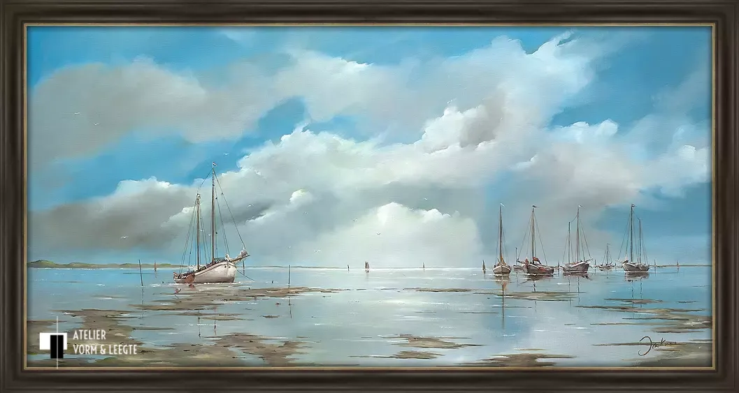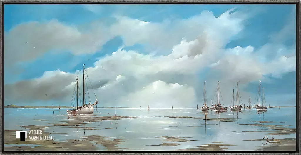Op dit doek van kunstschilder Jan Kooistra zie je een groep oude zeilboten (de bruine vloot) voor anker liggen. Het is laag tij en pas als het weer hoog tij wordt kunnen de schepen weer uitvaren. De wolkenlucht op dit werk is spectaculair en de achterliggende zon maakt het nog specialer. Er is geen zuchtje wind zodat er geen enkele rimpeling op het water te bekennen is.