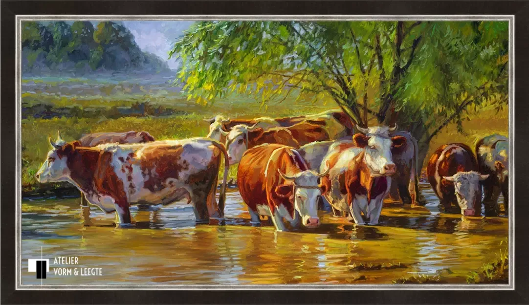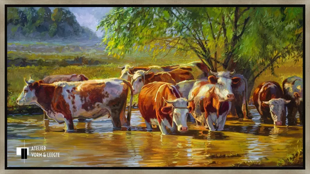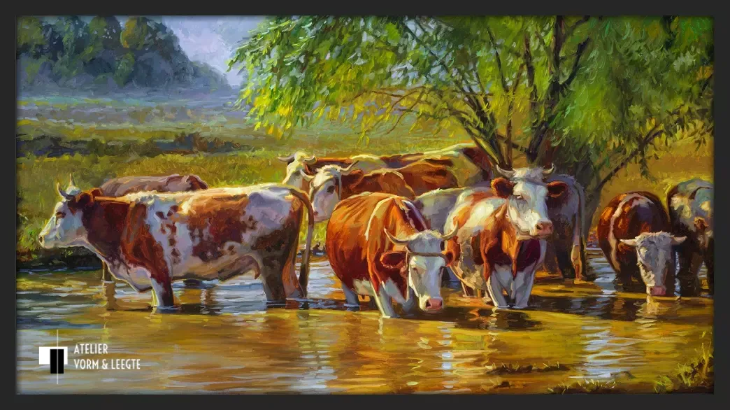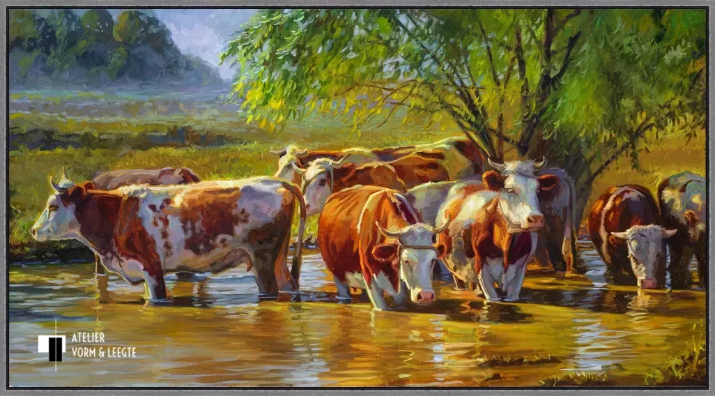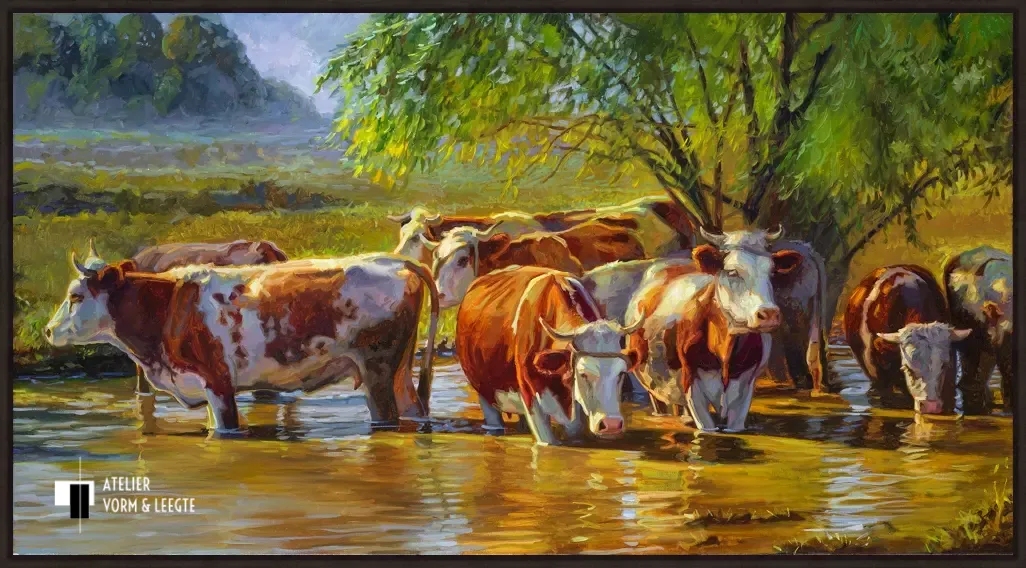 Een beeld vol landelijke romantiek van een kudde koeien in het stralende zomerweer. Om zich te beschermen tegen de hitte van de zon zoekt een groep roodbont vee verkoeling in het water van de beek en de lichte schaduw van een wilgenboom. Kunstschilder Jan van 't Hoff heeft de groep prachtig op het doek vereeuwigd, waarbij het stralende zonlicht een belangrijke rol speelt. De gouden zonnestralen doen de kleuren van de koeien nog mooier uitkomen. Het warm oranjebruin geeft ook een mooi contrast met het groen van de boom.