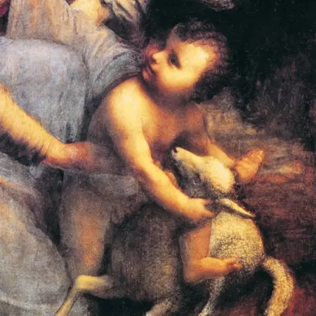 Op deze voorstelling van Da Vinci zien we de heilige Anna (de moeder van Maria) met haar dochter Maria op haar schoot. Dochterlief reikt daarbij uit naar haar kindje Jezus die ondertussen op een lammetje probeert te klimmen. Op de achtergrond zien we een rotsachtig gebergte met een enkele naaldboom. Het tafereel is warm van kleur.
