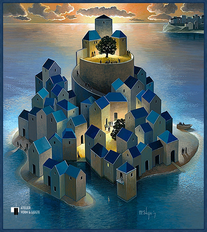 Het zijn kleine droomwerelden, de schilderijen van Michiel Schrijver. Niet bestaande dorpjes en haventjes aan zee die vriendelijk aandoen en die je uitnodigen erin te gaan verdwalen. Elk doek laat je even wegmijmeren in de uitgestrektheid en de geur van zilte zee…