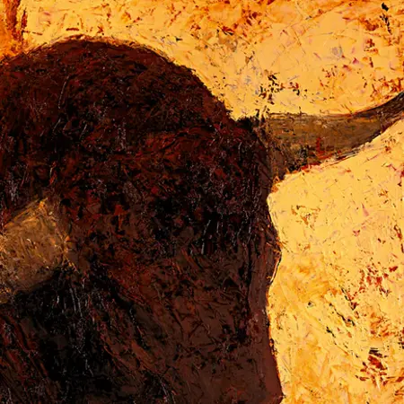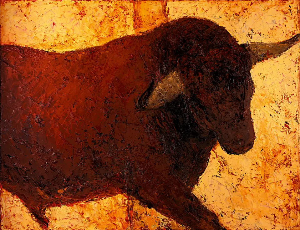 De stier die zowel kracht als elegantie en nederigheid in zich draagt en daarin onmetelijk groots en sterk is. In dit kunstwerk komt het allemaal samen: de passie, de kracht, de vurigheid en het temperament! Castano betekent letterlijk goudbruin-kastanjebruin-gebronsd en dat is precies wat de prachtige kleurtonen in dit werk ons laten zien. De stier komt hier van linksaf het doek ingelopen in een warmte en licht zoals alleen Rotgans dat overbrengen kan.