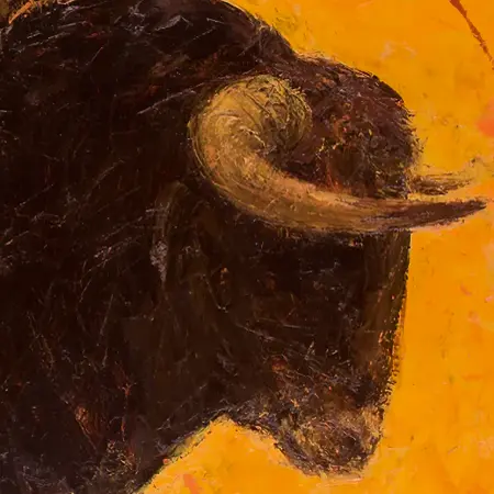 Een sfeerrijk beeld van een stier tegen een passievolle vurig oranje achtergrond waar het temperament van afstraalt. De horens van de stier lijken speciale aandacht te vragen door hun prachtige vorm. De stier is vanaf de zijkant afgebeeld met het accent op de rug. De langwerpige vorm van dit kunstwerk geeft het extra karakter.