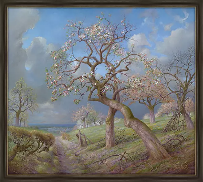Op dit kunstwerk van Patrick Creyghton zie je een paar oude appelbomen in bloei in de Limburgse Maasvallei. De bomen zijn net gesnoeid en de bloesems steken prachtig af tegen de blauwe lucht. De groene weiden en de glooiingen van het land geven het schilderij een landelijke romantische sfeer.