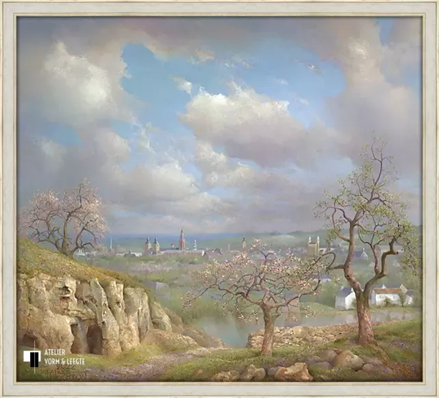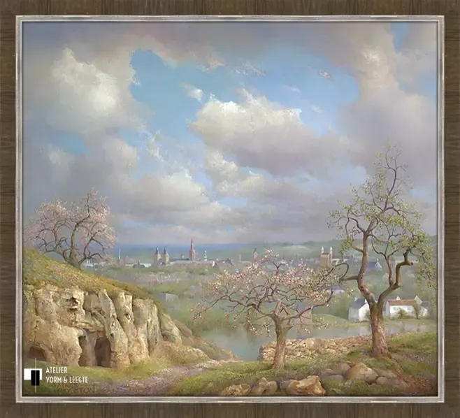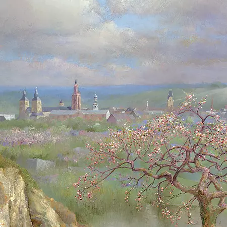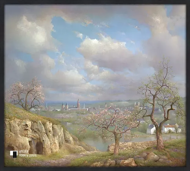Ja, het is echt waar! Dit sprookjesachtige tafereel bevindt zich gewoon in Nederland! Kunstschilder Patrick Creyghton heeft dit bijzondere landschap op doek vastgelegd op een manier die ons helemaal meeneemt naar de horizon toe. Vanaf een heuvel met bloeiende fruitbomen en de typerende mergelrotsen zien we in de verte een dal met een plaatsje opdoemen. Het is alsof het landschap ons steeds verder laat dwalen naar daar waar het land lijkt over te gaan in de wolkenlucht.