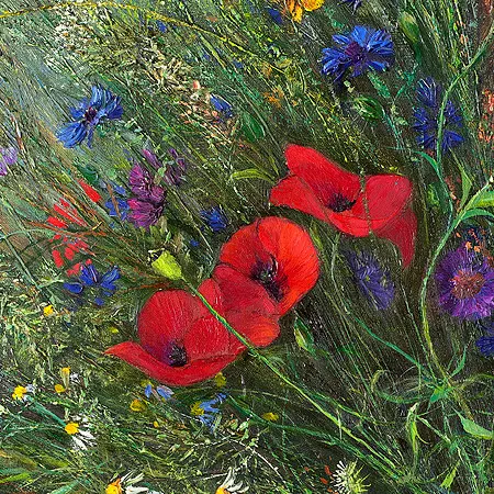 Op een houten tafel voorlangs een blauwgrijze muur staat een zinken emmer, waarin tal van bloemen prijken. Het veldboeket is op doek vastgelegd door kunstschilder Patrick Creyghton en heeft een aangename sfeer van natuurlijkheid. De rode klaproosjes en de blauwe korenbloemen zorgen voor de vrolijke noot in het samengestelde boeket.