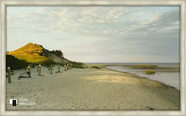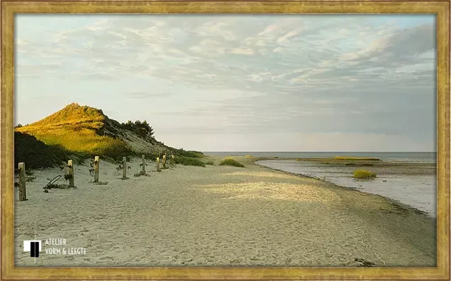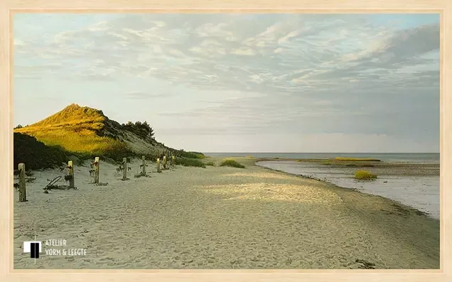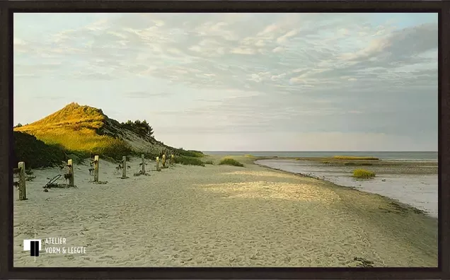 De laatste stralen van de zon lijken hier een spel te spelen met het zand en de duinen. Een prachtige wolkenlucht boven het strand en de rustige zee aan de rechterkant maken het plaatje compleet. Een wonderlijk verstillend fijn en bijna levensecht geschilderd werk van kunstschilder Peter van der Ploeg.