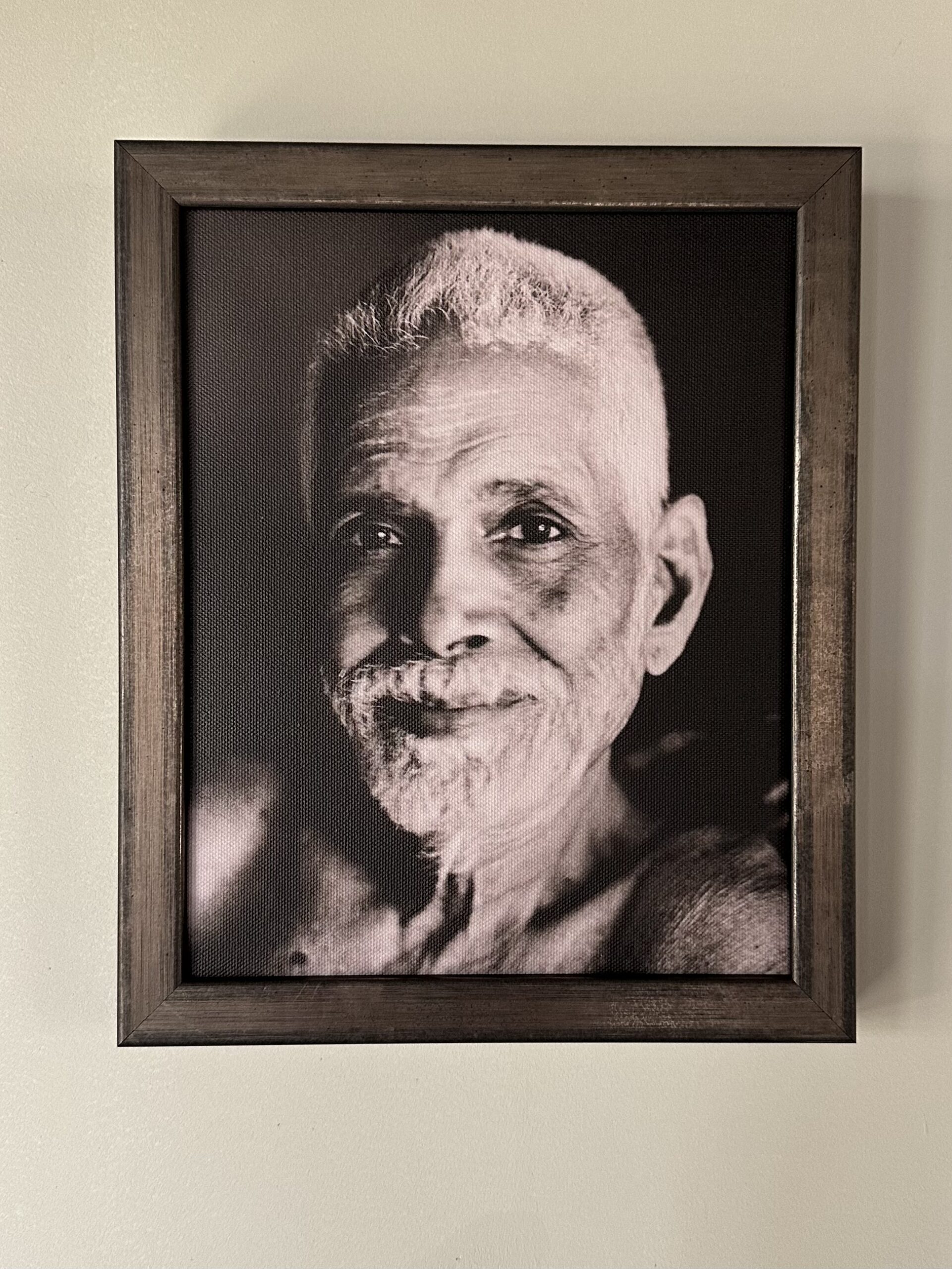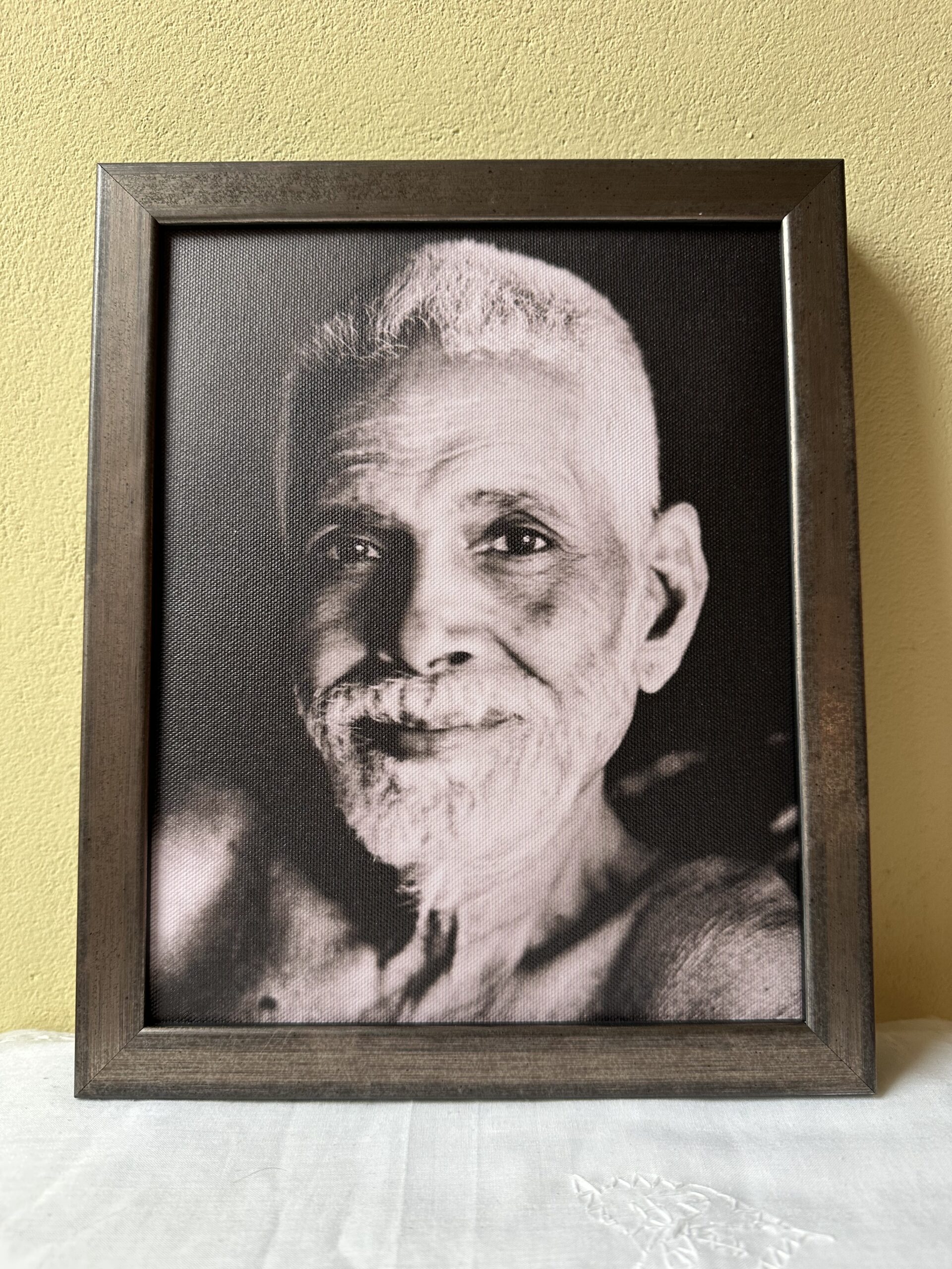 Dit is de meest bekende foto van Ramana Maharshi. Zijn blik is hier zo krachtig en zo vol van de leegte. De diepe vrede die de Zelfverwerkelijking geeft is hier zichtbaar, maar ook de absolute helderheid die het mogelijk maakt dat alles wat nog als ego ronddwarrelt gezien kan worden. In darshan gaan met deze foto van Ramana is een krachtig hulpmiddel op het pad van Zelfverwerkelijking.