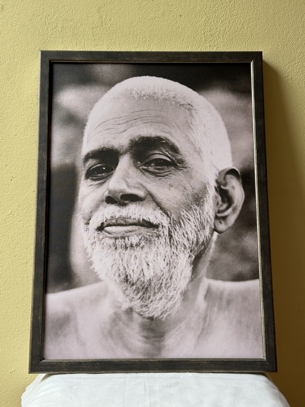 Het moment dat de gerealiseerde heilige zijn blik op jou laat rusten begint de Goddelijke genade te stromen. Gezien worden door Ramana Maharshi is een kwelling voor het ego, maar een zegen voor dat in ons dat de bevrijding zoekt. Via deze foto is het fantastisch om met Ramana in darshan te gaan, omdat deze blik de donkere spelonken en verborgen plekken in onszelf zichtbaar maakt. Zodra dit in het licht komt, begint het te transformeren en verliest het zijn grip. Een prachtige foto voor de ware zoeker.