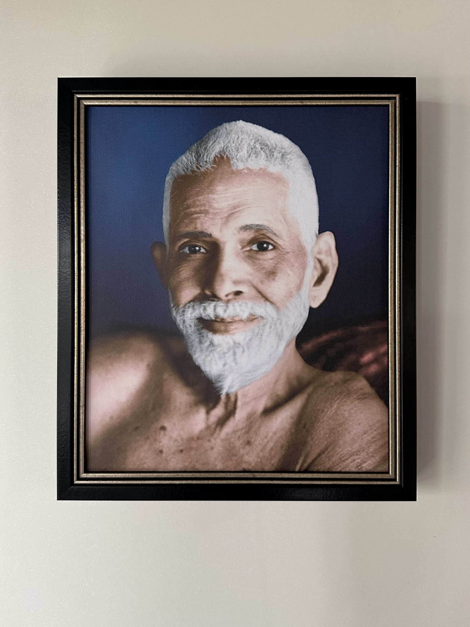 Dit is de meest bekende foto van Ramana Maharshi. Zijn blik is hier zo krachtig en zo vol van de leegte. De diepe vrede die de Zelfverwerkelijking geeft is hier zichtbaar, maar ook de absolute helderheid die het mogelijk maakt dat alles wat nog als ego ronddwarrelt gezien kan worden. In darshan gaan met deze foto van Ramana is een krachtig hulpmiddel op het pad van Zelfverwerkelijking.