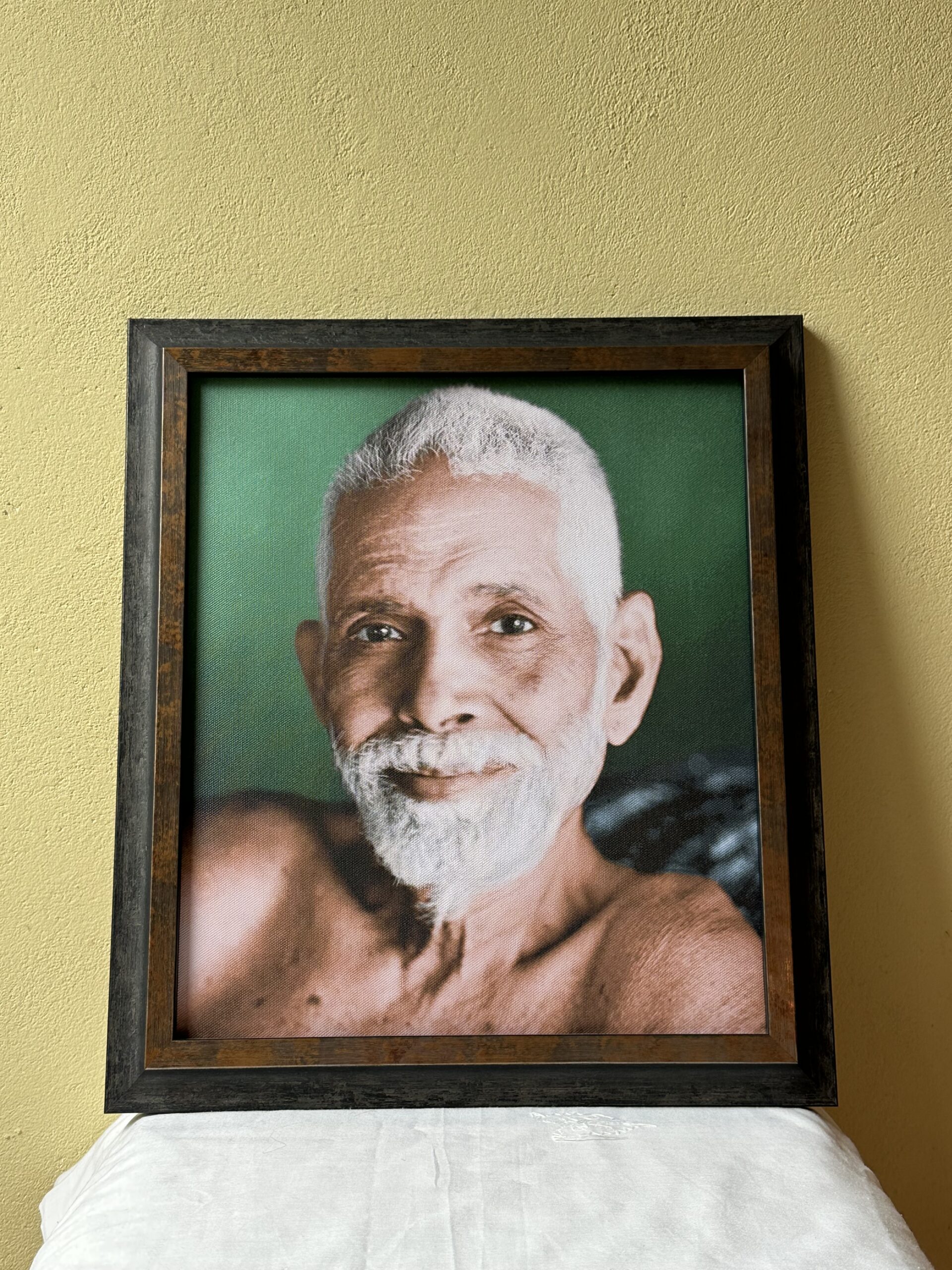 Dit is de meest bekende foto van Ramana Maharshi. Zijn blik is hier zo krachtig en zo vol van de leegte. De diepe vrede die de Zelfverwerkelijking geeft is hier zichtbaar, maar ook de absolute helderheid die het mogelijk maakt dat alles wat nog als ego ronddwarrelt gezien kan worden. In darshan gaan met deze foto van Ramana is een krachtig hulpmiddel op het pad van Zelfverwerkelijking.