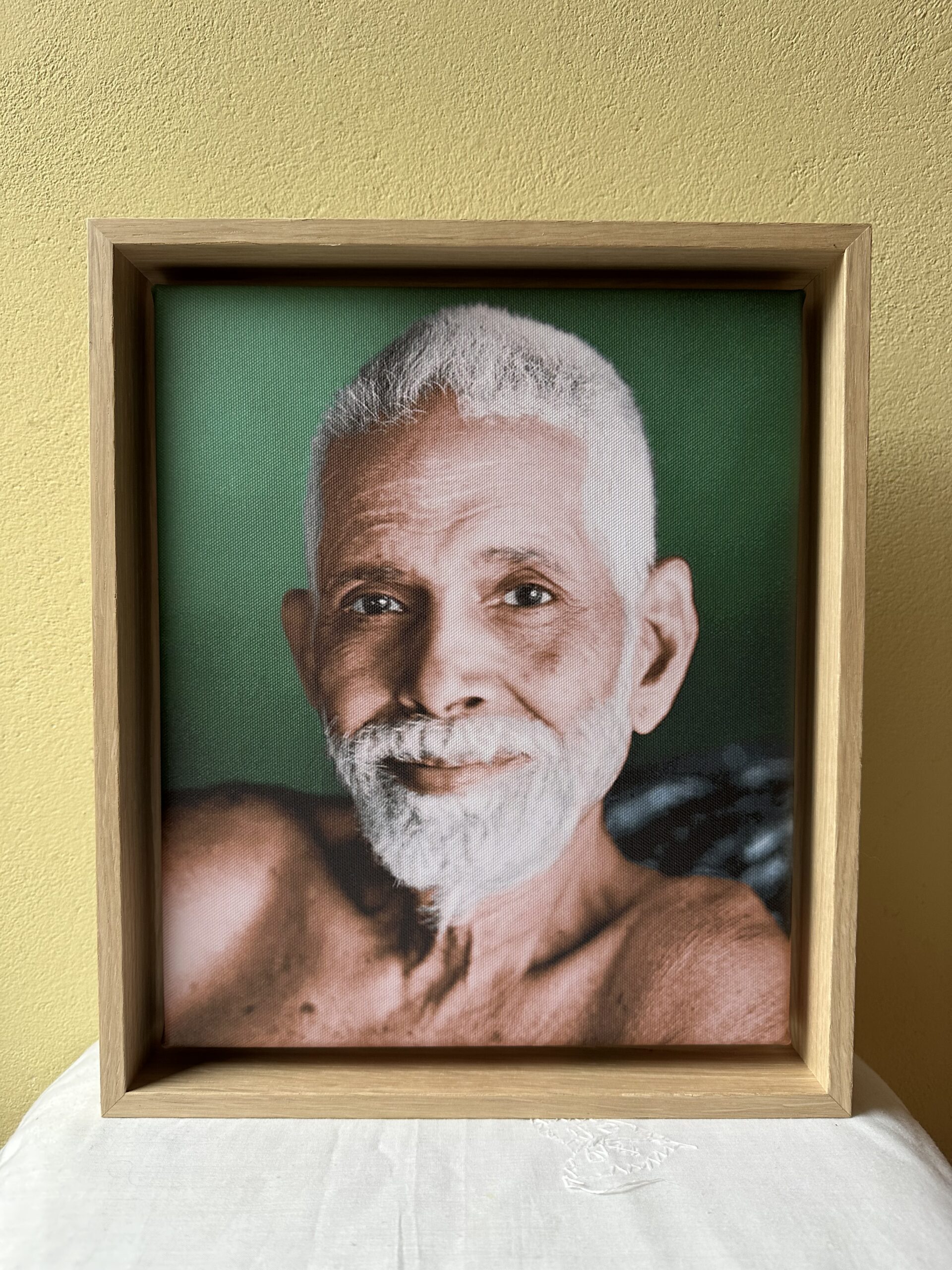Dit is de meest bekende foto van Ramana Maharshi. Zijn blik is hier zo krachtig en zo vol van de leegte. De diepe vrede die de Zelfverwerkelijking geeft is hier zichtbaar, maar ook de absolute helderheid die het mogelijk maakt dat alles wat nog als ego ronddwarrelt gezien kan worden. In darshan gaan met deze foto van Ramana is een krachtig hulpmiddel op het pad van Zelfverwerkelijking.