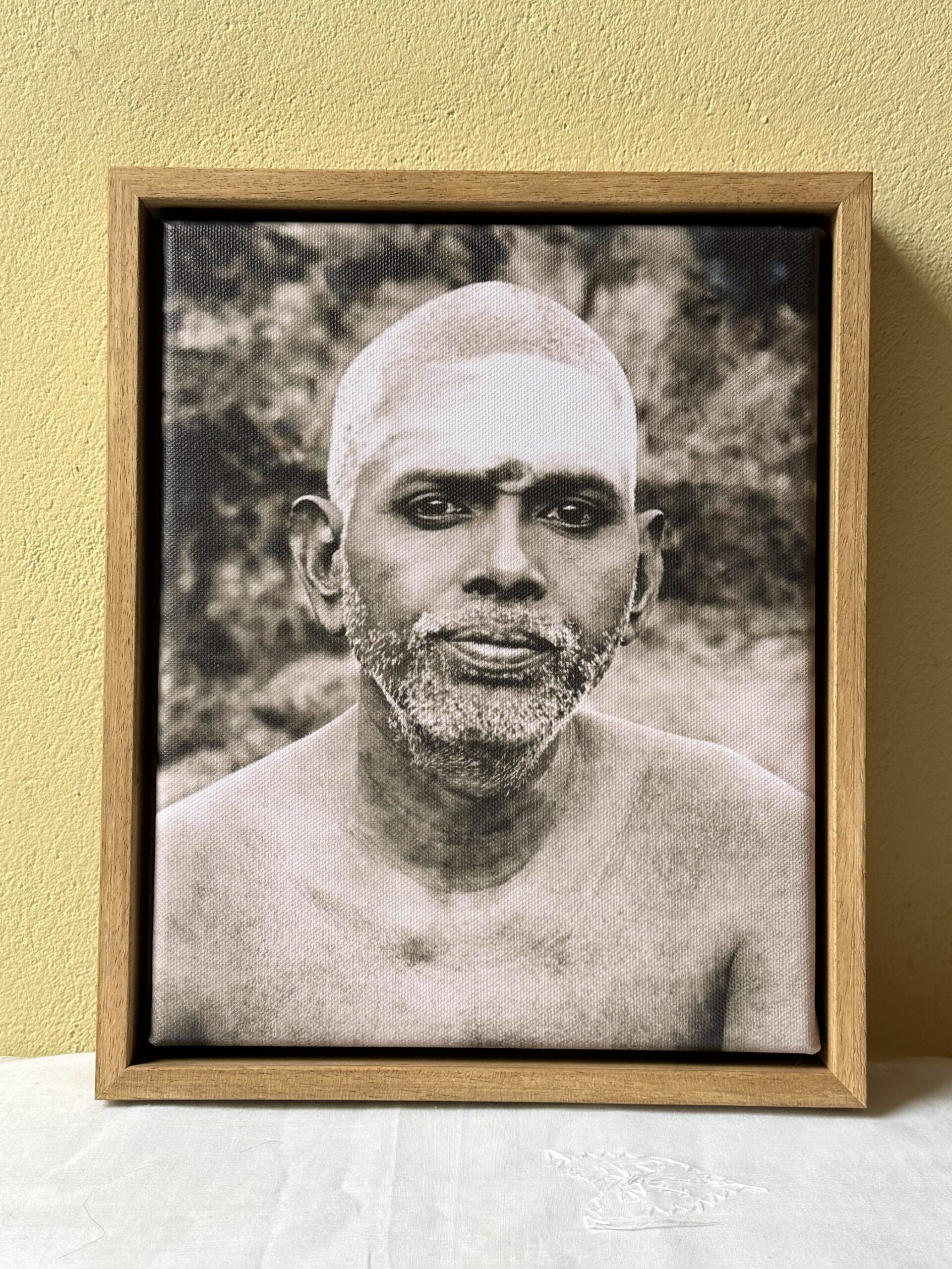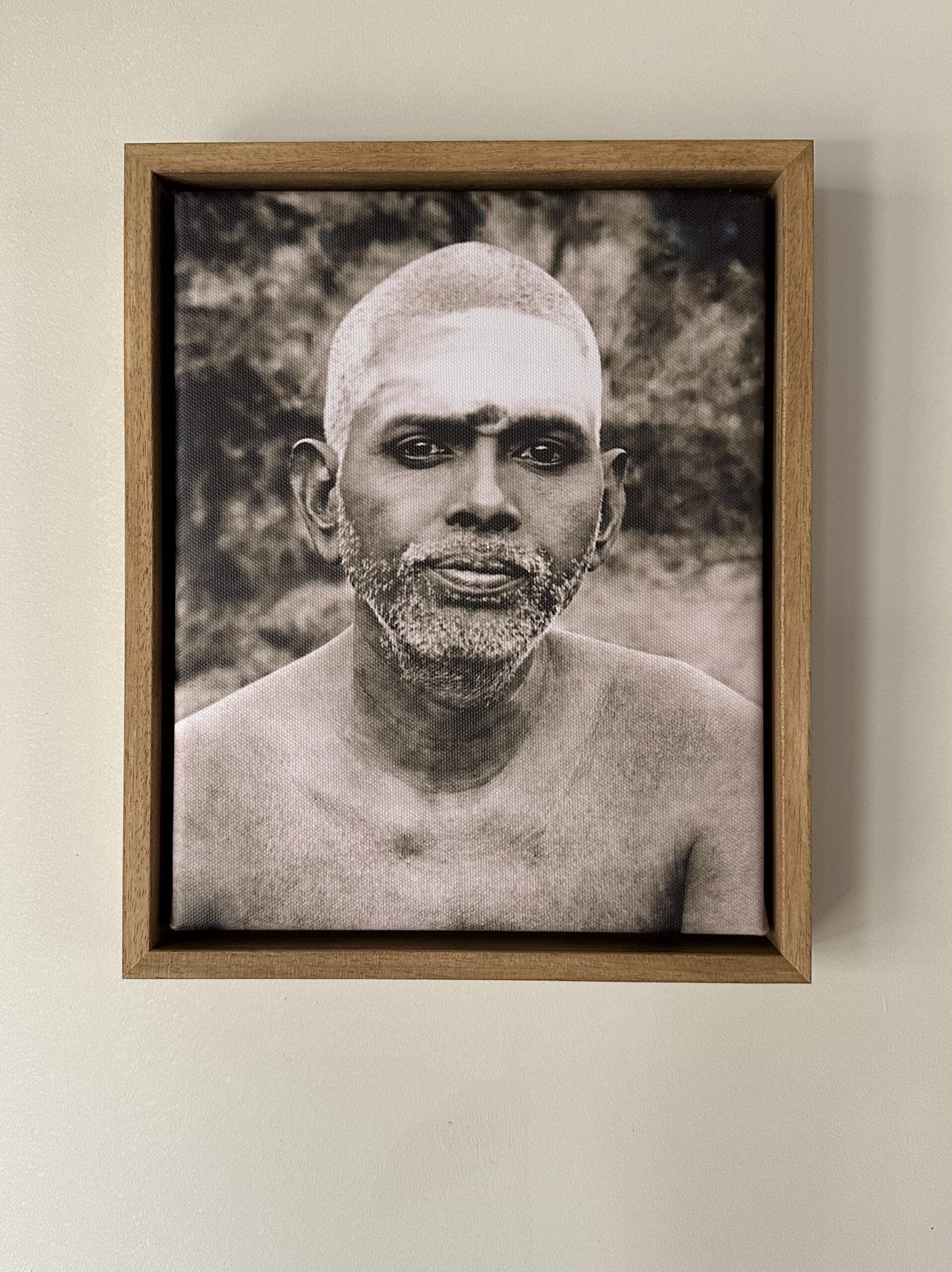 Deze Ramana foto draagt de titel ‘Vibhuti’ en is hier uitgevoerd als giclée op canvas. Het formaat is 20 x 25 cm (incl. lijst 23 x 28 cm) en het is ingelijst in een Atelier baklijst die handgekleurd is in de kleur eiken. De zichtrand van de lijst is 1cm en de tussenruimte naar het doek toe is 0,5 cm.