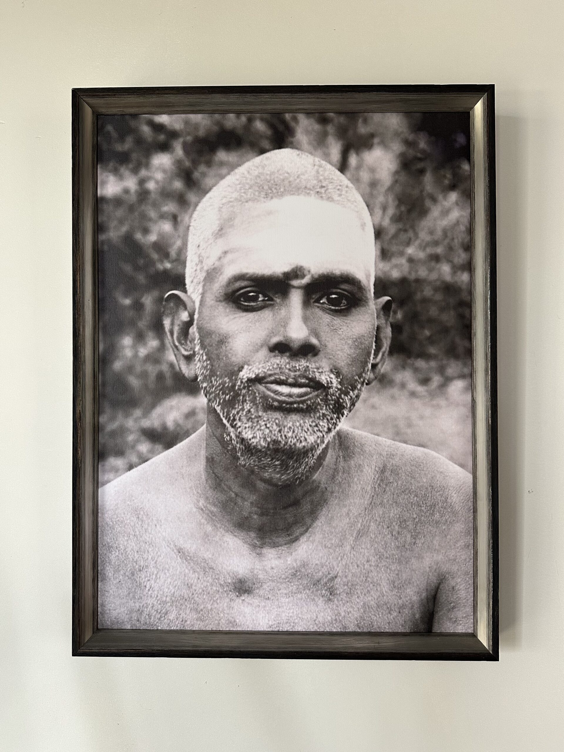 Deze Ramana foto draagt de titel ‘Vibhuti’ en is hier uitgevoerd als giclée op canvas. Het formaat is 40 x 55 cm (incl. lijst 44 x 59 cm) en het is ingelijst in een Vienna schilderijlijst die matzwart is met een schuine zilveren binnenrand.