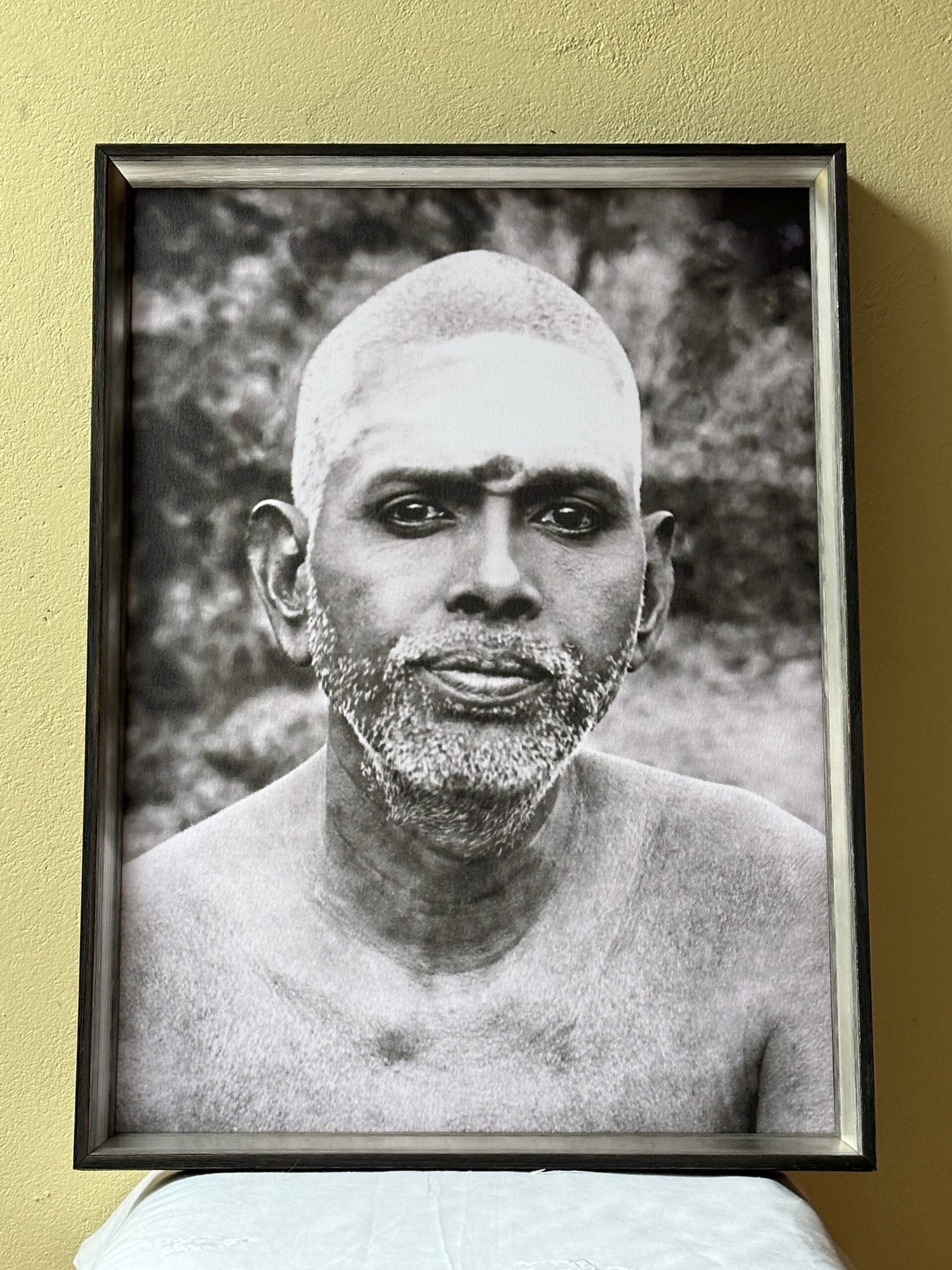 Op deze foto heeft Ramana de heilige as (Vibhuti) op zijn voorhoofd. Soms denken mensen dat er een lichtvlek op de foto zit, maar dat is dus niet zo. De as is een verwijzing naar het volledig verbrandde ego en wordt binnen het hindoeïsme op verschillende delen van het lichaam aangebracht om het hogere te eren.