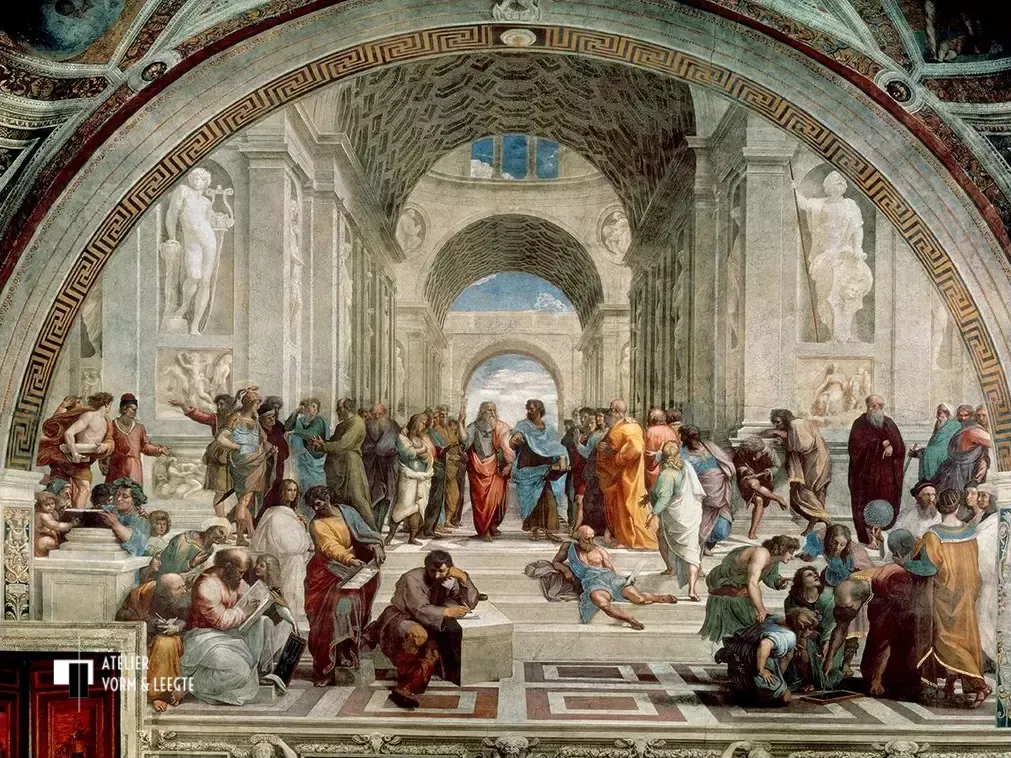 Dit meesterwerk van Raphael draagt de titel 'School van Athene'. Hij heeft het geschilderd in de jaren 1509-1510 als fresco in het Apostolisch Paleis van het Vaticaan (zie afbeelding). Een fresco is een schildering die rechtstreeks in de nog natte kalk wordt gemaakt. Het schilderij is op die manier voor altijd verbonden met het gebouw waar het in geschilderd is.