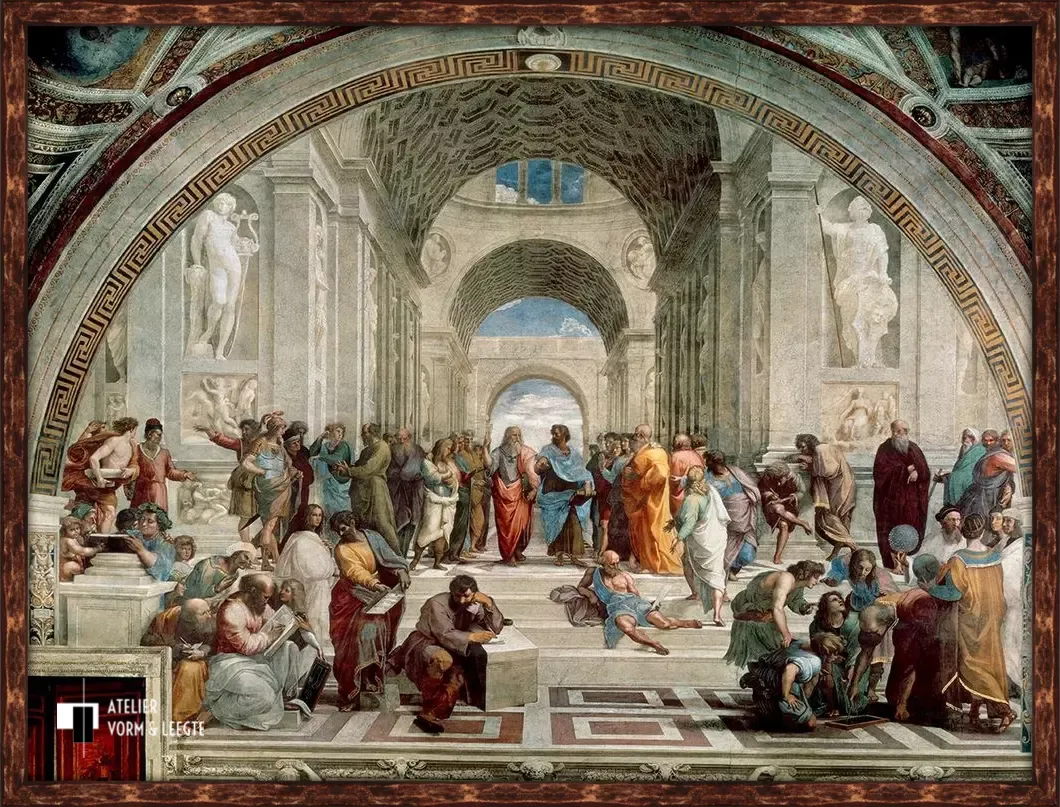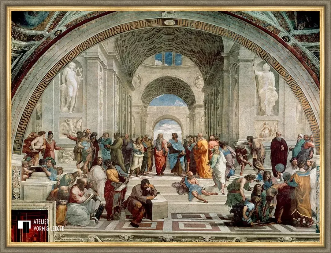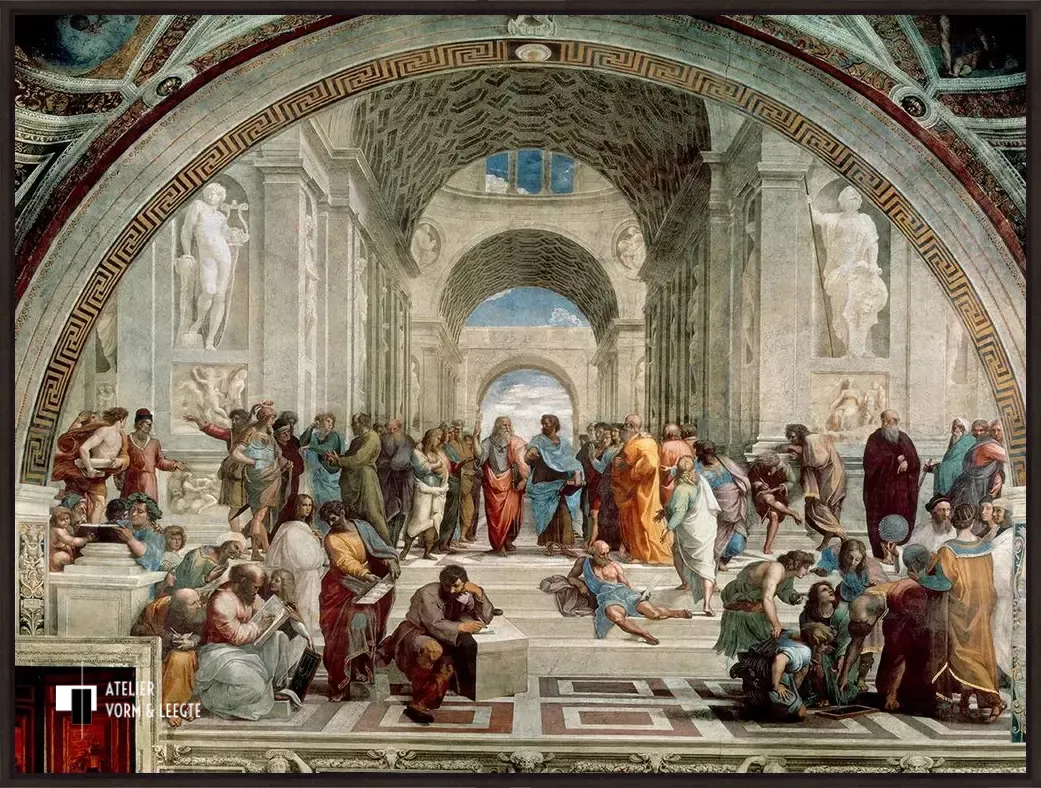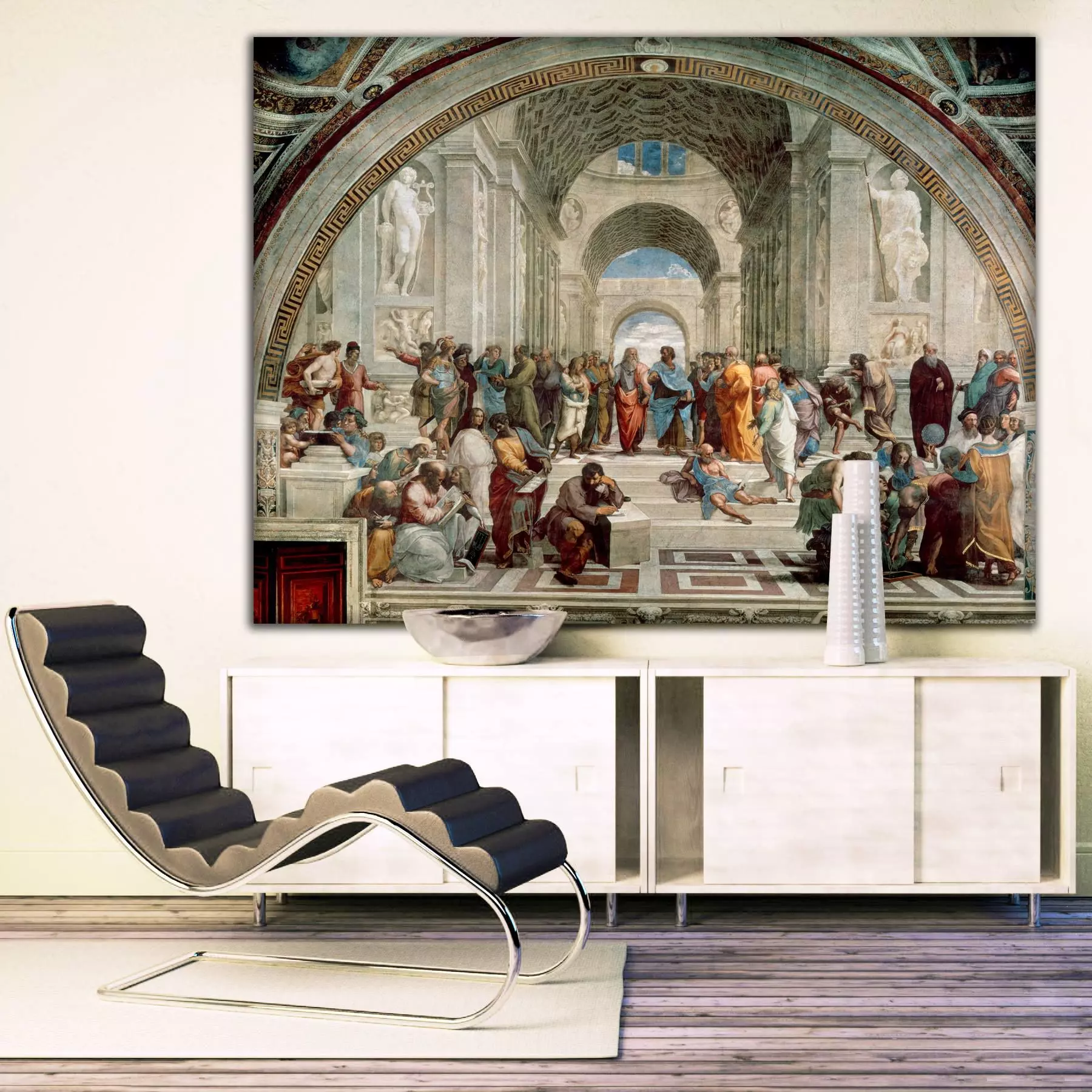 De school van Athene is een fresco van Raphaël, uitgevoerd als giclée op canvas.