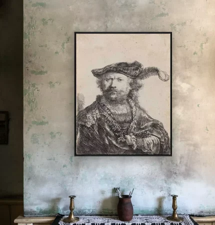 Op dit zelfportret van Rembrandt van Rijn staat hij rijk uitgedost afgebeeld met snor en baard. De kleding is rijkelijk en op zijn hoofd draagt hij een fluwelen baret met pluim. De blik is ernstig op dit portret. Het werk was destijds door hem als ets uitgevoerd.