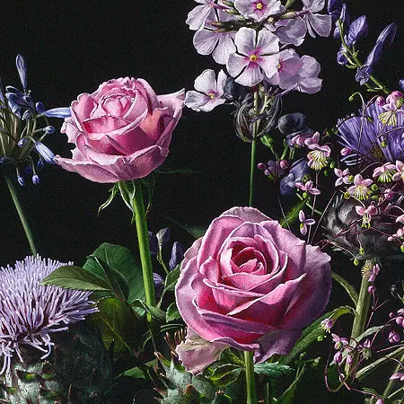 Een sfeervol rose-paars boeket van o.a. phlox, rozen, margrietjes en een enkele passiebloem. Het geheel staat prachtig bijeen geschikt in een keramieken vaas. Dit bloemrijk geheel is door Roman Reisinger met een uiterste precisie en fijngevoeligheid op het doek gezet. De donkere achtergrond en de grijze vaas doen de bloemen nog mooier uitkomen.