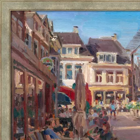 We maken het kunstwerk alvast inlijstklaar en zetten het op de ezel. We tonen de hoekmonsters van de lijsten dan in combinatie met het kunstwerk per videobelafspraak zodat je het real live kunt beoordelen. We kunnen dan ook overleggen als er nog andere wensen zijn.