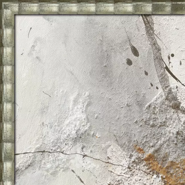 De lijst is geheel verzilverd en en heeft een fraaie gevormde afwerking op de bovenzijde; dat lijken allemaal rechthoekige vlakjes te zijn die gewelfd in elkaar overlopen . De lijst is aan de buitenzijde hoger dan aan de beeldzijde, waardoor het kunstwerk dat je er in plaats veel accent krijgt.
